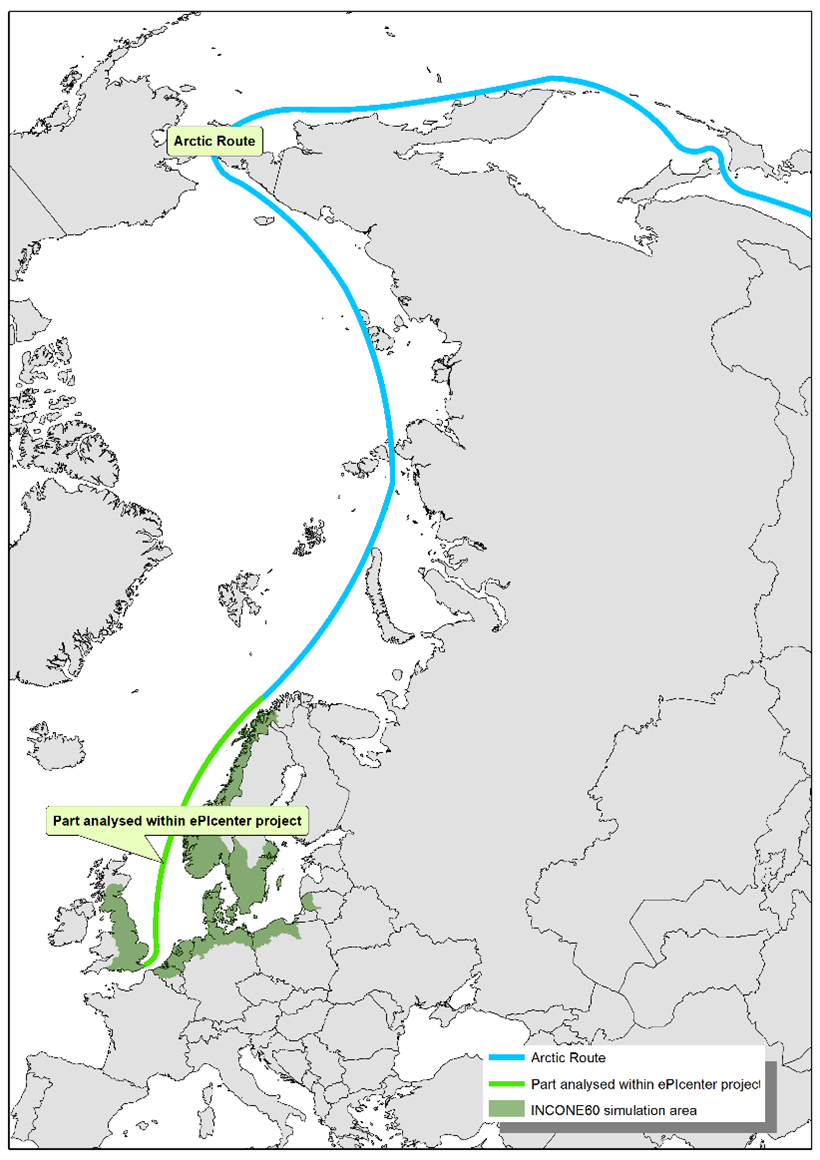 The international waterway E60 runs from Gibraltar to the north along the coast, reaching as far as Arkhangelsk. Northern Sea transport could not be analysed without considering the importance of Arctic routes and their impact on the global economy and worldwide shipping network. ePIcenter also puts its focus on Arctic Routes transportation. Therefore, the research area of this initiative is in complete synergy with the INCONE60 project creating even more impact possibilities. The Northern Sea Route, part of the Northeast Passage, the only route currently used for commercial transport, is most crucial from the perspective of INCONE60 – ePIcenter implementation. Therefore, part of the Arctic Route has been added to the INCONE60 model.